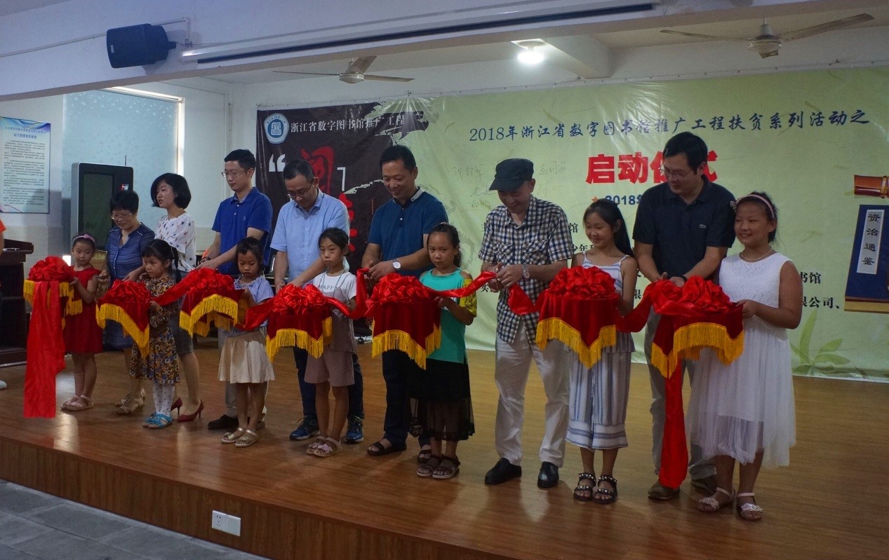 活動(dòng)現場(chǎng),天臺縣文化廣電新聞出版局副局長(cháng)陳邦軍、浙江圖書(shū)館工會(huì )主席詹利華、浙江省青少年科技活動(dòng)中心部長(cháng)趙國治、臺州市圖書(shū)館館長(cháng)毛旭、天臺縣圖書(shū)館館長(cháng)王水球、北京方正阿帕比技術(shù)有限公司經(jīng)營(yíng)中心副總經(jīng)理戴鵬、五洲融媒體科技股份有限公司副總經(jīng)理楊然為此次活動(dòng)攜手剪彩。